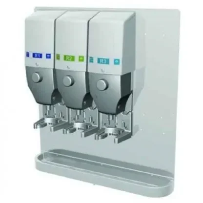 - 1 x Platte mit 3 vormontierten Spendern zur Flaschenbefüllung. Möglichkeit, einen vierten Spender entweder zur Flaschen- oder Eimerbefüllung zu montieren (h:725/b:700/d:157mm)