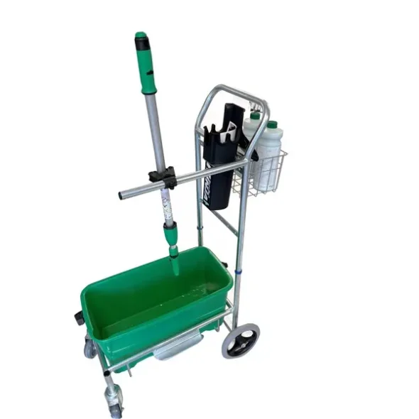 Dieser praktische Wagen bietet Platz für einen Eimer, eine Halterung für einen Teleskopstiel, einen Halter für Werkzeuge sowie einen kleinen Korb für Seife und Tücher.
