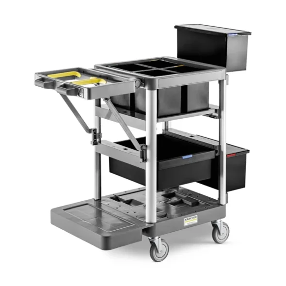 Als kompakter und offener Reinigungswagen ist der FM Expert 50/ P besonders geeignet für den Einsatz mit der Vorbehandlungsmethode. Das Entsorgungsmodul kann je nach Bedarf nach oben und unten verstellt werden und bietet Platz für Müllsäcke in verschiedenen Größen. Reinigungsutensilien können in den vier 6-Liter-Eimern aufbewahrt und nach Bereich getrennt werden. Zusätzliches Zubehör kann in einer 16-Liter-Auszugsschublade verstaut werden, die je nach Bedarf positioniert werden kann. Das reduziert den Bedarf an Hin- und Rückwegen während des Reinigungsprozesses. Dank der mitgelieferten FlexiLink-Verbindungen lassen sich Mopps, Greifer und andere nützliche Utensilien bequem mitführen. FlexoLink XL eignet sich zur Befestigung eines Warnschilds oder WVP 10 Adv. Sowohl die Toolflex-Verbindungen als auch der Haken können je nach Bedarf an der Außenseite von FlexoMate befestigt werden. Der hängende Eimer und die Ablagen lassen sich leicht abnehmen, um Platz zu sparen, wenn der Reinigungswagen gelagert wird.