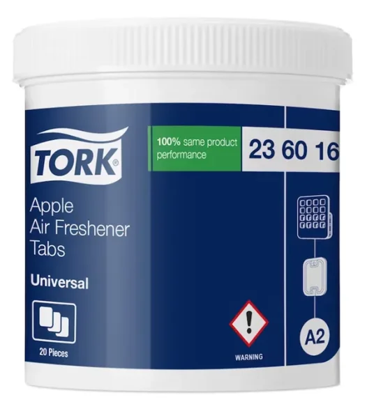TORK Lufterfrischer in Tabs, frischer Apfelduft. Wechselt die Farbe, wenn ein Austausch erforderlich ist: einfache Wartung