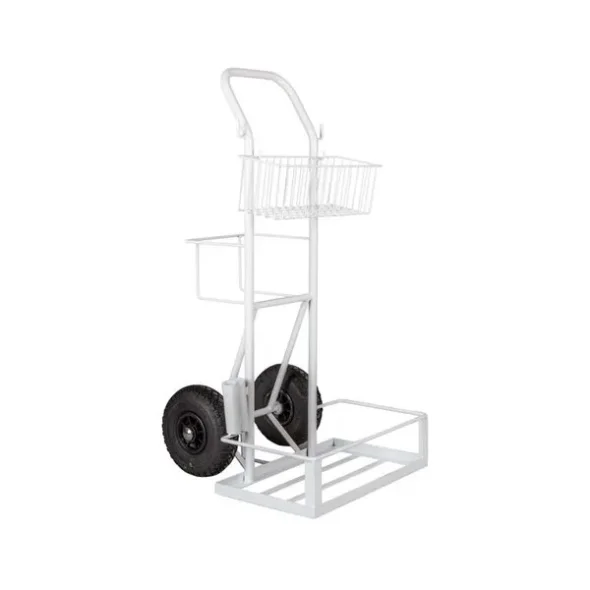 Der Wagen wird mit Luftgummirädern & starlock Kapsel geliefert. Der Korb wird an 2 Haken vorne am Wagen montiert. Zusätzlich gibt es 2 extra Haken zum Aufhängen von Werkzeugen. Außerdem befinden sich auf einer Seite 2 Gerätehalter für Stiele.