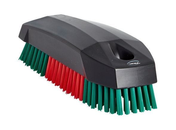Nagelbürste aus schwarzem Polypropylen mit harten roten/grünen Filamenten. Diese Nagelbürste ist deutlich größer als herkömmliche Nagelbürsten auf dem Markt und daher ideal für Werkstätten und andere Orte, an denen eine gründliche Reinigung erforderlich sein kann. Sie ist beständig gegen Chemikalien und hohe Temperaturen.