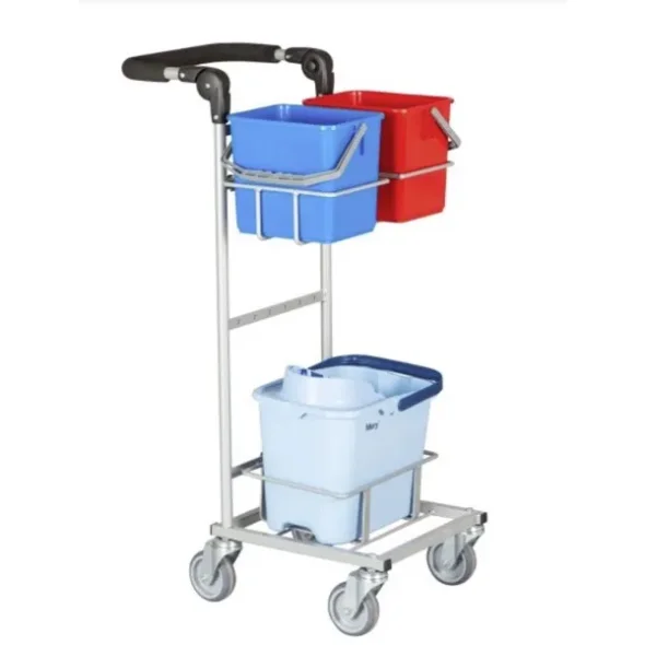 Dieser Wagen gehört zur Ergo Slimline-Serie. Mit seinen 40 x 40 cm. am Grundrahmen benötigt der Wagen nur minimalen Platz, wenn der Griff heruntergeklappt ist. Zum Wagen gehören 2 Stk. 6-Liter-Eimer & Mery-Eimer, dazwischen befindet sich ein Gerätehalter zwischen den Eimern. Der Wagen wird mit 4 Stk. 100-mm-Rädern geliefert.