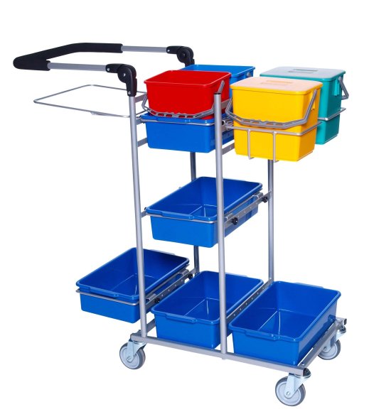 Zum Wagen gehören 1 Stk. Kunststoffwanne mit 2 Stk. 6-Liter-Eimer mit Deckel, 2 Stk. 6-Liter-Eimer, 3 Stk. Kunststoffwannen zur Aufbewahrung sowie ein 110-Liter-Abfallsackständer mit Kunststoffwanne als Stütze. Außerdem enthalten sind 2 Stk. Gerätehalter sowie 1 Stk. Mopphalter.
