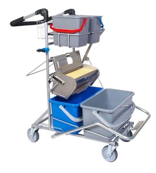 Zum Wagen gehören 2 Stk. 6-Liter-Eimer, 2 Stk. 22-Liter-Eimer, Fußpresse inkl. Schwamm, kleiner Drahtkorb sowie 60-Liter schräger Abfallständer. Außerdem gehören 1 Stk. Gerätehalter, 1 Stk. toolflex 20-30 mm sowie 1 Stk. Mopphalter dazu.
