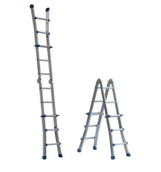 Robuste Aluminiumkonstruktion, Unabhängig verstellbare Seiten für Treppen, Kann als Stehleiter und Anlegeleiter verwendet werden, Klappscharnier für werkzeuglosen Umbau und Kompakte Abmessungen für einfachen Transport.