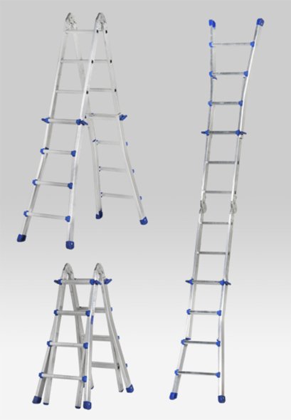 Das Messerscharnier am Kopf der Stehleiter lässt sich mit einem leichten Griff, ohne Werkzeug, verstellen, und die Leiter kann zu einer langen Anlegeleiter ausgeklappt werden.