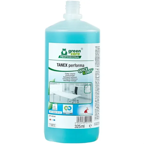 • TANEX performa Quick&Easy eignet sich hervorragend für die Anwendung auf allen Kunststoff- und kunststoffbeschichteten Oberflächen, sowohl innen als auch außen. Perfekt geeignet zur Reinigung von Tischen, Türen, Schränken, Regalen und Wandpaneelen.Verwenden Sie dieses Produkt nicht auf unversiegeltem Holz, lackierten Materialien und Acrylglas. Für unser QUICK & EASY System empfehlen wir, das Wasser nach 24 Stunden zu wechseln. Hinweise zu Produktsicherheit, Lagerung und Umweltbedingungen Sicherheit: Nur für den gewerblichen Gebrauch. Für Kinder unzugänglich aufbewahren. Produkt nicht mit anderen Produkten mischen. Prüfen Sie zunächst die Materialverträglichkeit an einer nicht sichtbaren Stelle. Lagerung: Bei Raumtemperatur im Originalbehälter aufbewahren. Umweltbedingungen: Nur die vollständig entleerte Verpackung bei der Recyclingstation abgeben. Eine korrekte Dosierung ist günstiger und minimiert die Umweltbelastung. Im Vergleich zu anderen Produkten wird empfohlen, eine geringere Menge zu verwenden.