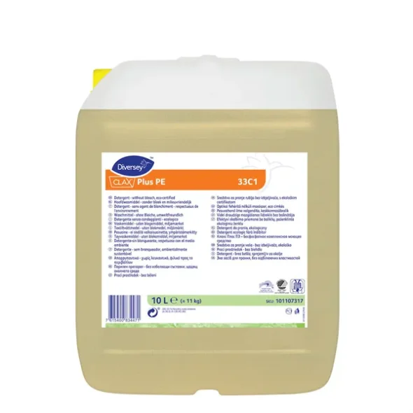 Clax Plus PE ist ein niedrigalkalisches, mildes Produkt auf Basis einer wirksamen Mischung aus Tensiden, Kalkbinder, Vergrauungsschutzmitteln und Enzymen. Das phosphatfreie Kalkbindesystem sorgt für eine niedrige Konzentration von Wasserhärteionen und verhindert dadurch die Ausfällung von Waschmittelkomponenten. Clax Plus PE ist mit einer Tensidmischung formuliert, die eine gute Entfernung von Partikeln, Fett und Schmutz gewährleistet. Das Vorhandensein proteolytischer Enzyme führt zum Abbau von Proteinen und ermöglicht dadurch eine effektive, gezielte Entfernung von proteinhaltigem Schmutz wie z. B. Blut- und Lebensmittelflecken. Clax Plus PE wird zur Reinigung von (farbigen) Textilien aus Krankenhäusern und anderen Gesundheitseinrichtungen, Hotels und Restaurants eingesetzt. Darüber hinaus eignet sich das Produkt zum Waschen von Mikrofaser-Mopps und -Tüchern sowie anderen empfindlichen Produkten, da es kein Bleichmittel enthält