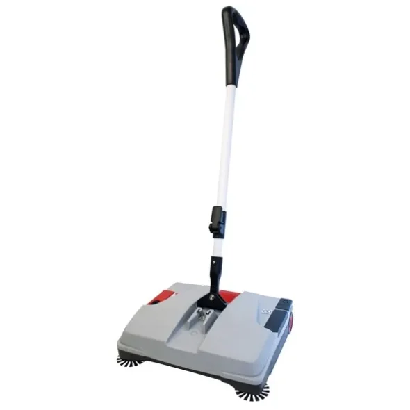 Batteriebetriebene Kehrmaschine mit Seitenbürsten. Verstellbarer Griff. Zusammenklappbar, kann auf dem Reinigungswagen mitgenommen werden. Niedrig, nur 10 cm, passt unter niedrige Möbel. Großer Behälter für Staub und Schmutz. Größe 35x30x10 cm. Laufzeit 45 Min. (Harter Boden).